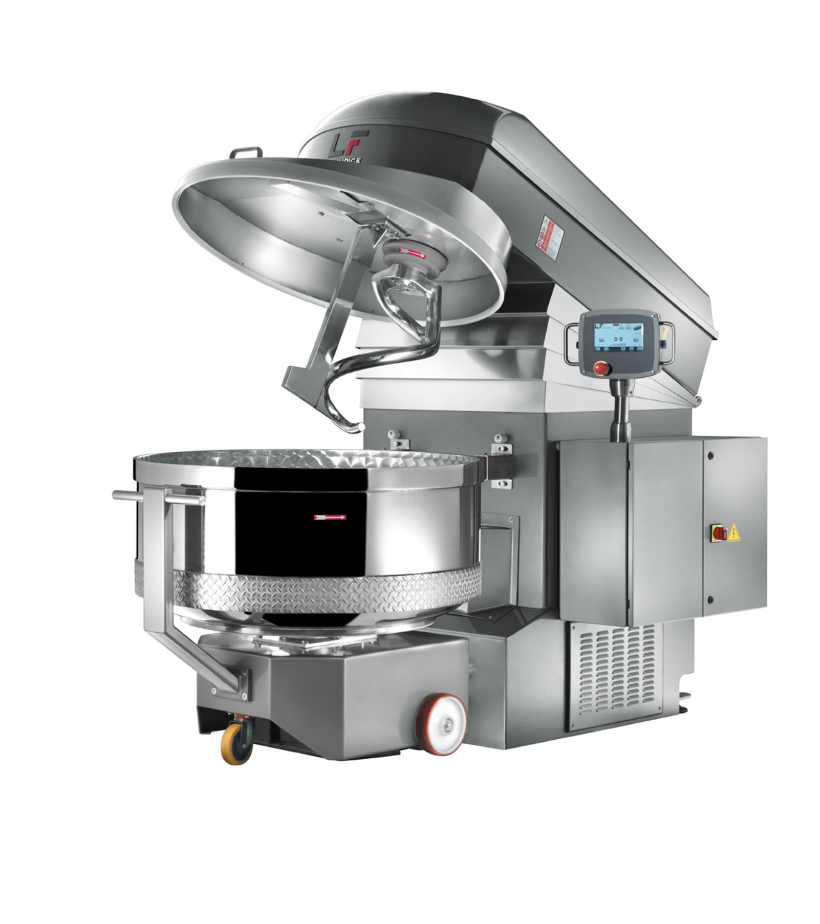 Línea industrial de amasadoras de espiral con artesa extraíble.