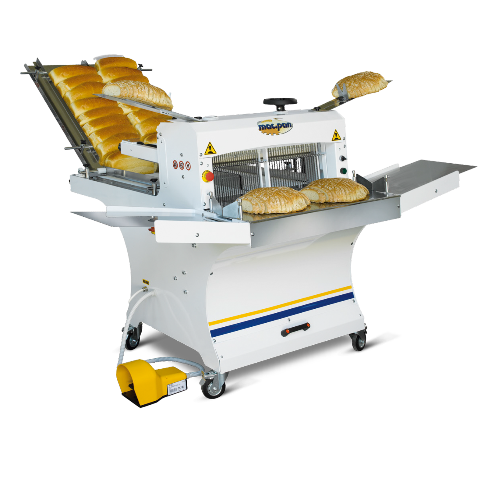 Correas especiales diseñadas para cortadoras de pan. La velocidad de ambas correas, superior e inferior, puede regularse durante el movimiento. La altura de la correa superior puede regularse. Facilidad de movimiento gracias a las 4 ruedas. El grosor de la rebanada de pan puede fijarse entre 8-22 mm. Fiable, bajo nivel de ruido. Cuchillas fáciles de cambiar. Cuchilla de gravedad ajustable de acero inoxidable. Guías laterales ajustables.